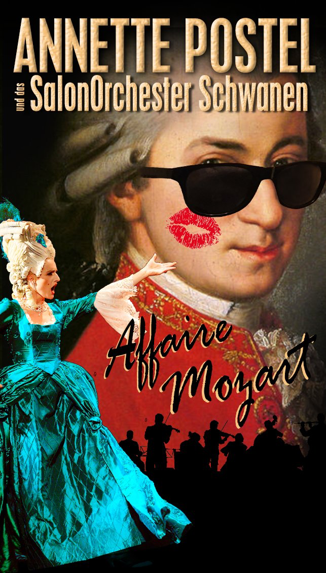 und das Salonorchester Schwanen, das ist eine süchtigmachende Droge“, schrieb das Badische Tagblatt. Die 11 Berufsmusiker mit der riesengroßen Portion Humor wenden sich ihrem Lieblingskomponisten zu, werden mozärtlich und beginnen eine „erstklassische“ Affaire mit Wolfgang Amadeus. „Natürlich nimmt sich die "Komödiantin der Spitzenklasse“ (BNN) bei Mozart à la Postel allerlei Freiheiten heraus und das Salonorchester Schwanen mischt aus seinen vielen musikalischen Ecken Cross-over mit Mozart, Schokokugeln mit Liebesseufzern, Zärtliches mit Deftigem. Ganz ohne alte Zöpfe!